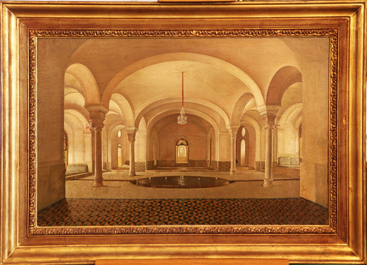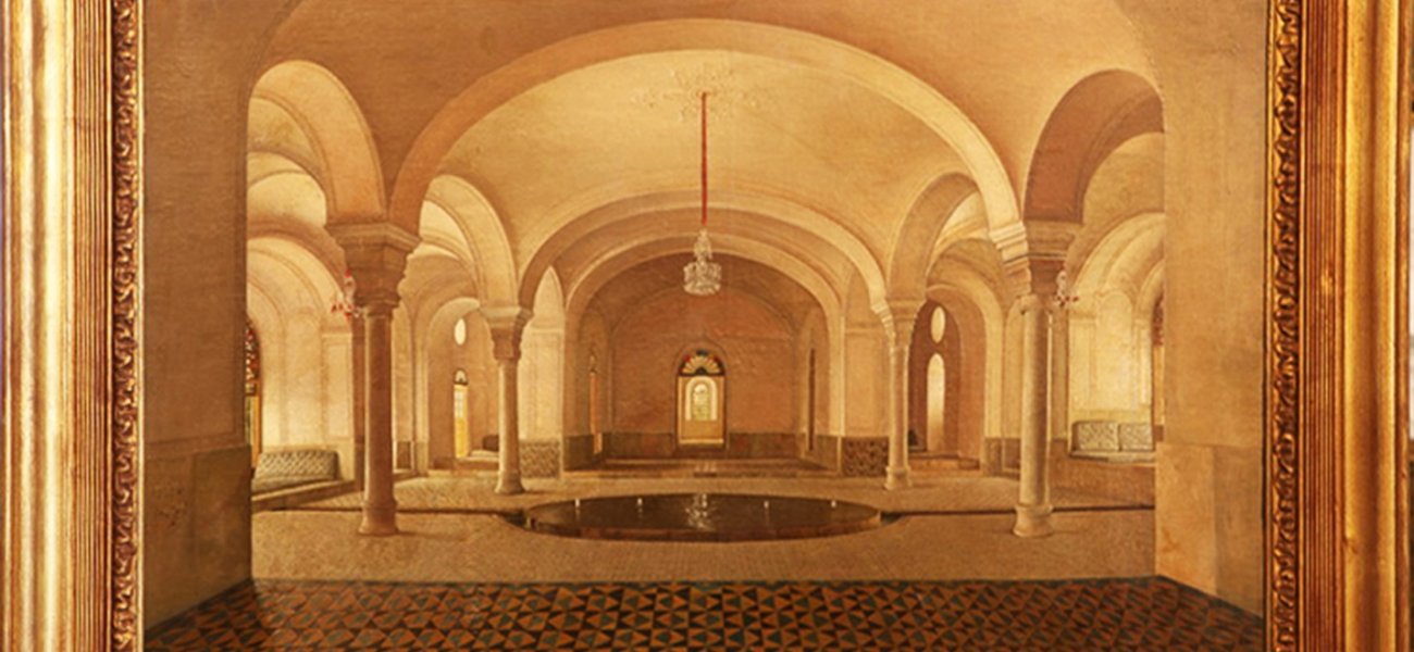 Caption: The Pool House of the Sahebqaraniyeh Palace in 1301 AH / 1883 AD; painted by Kamal al-Molk; oil on canvas; preserved at the Sahebqaraniyeh Palace within the Niavaran Cultural-Historical Complex.