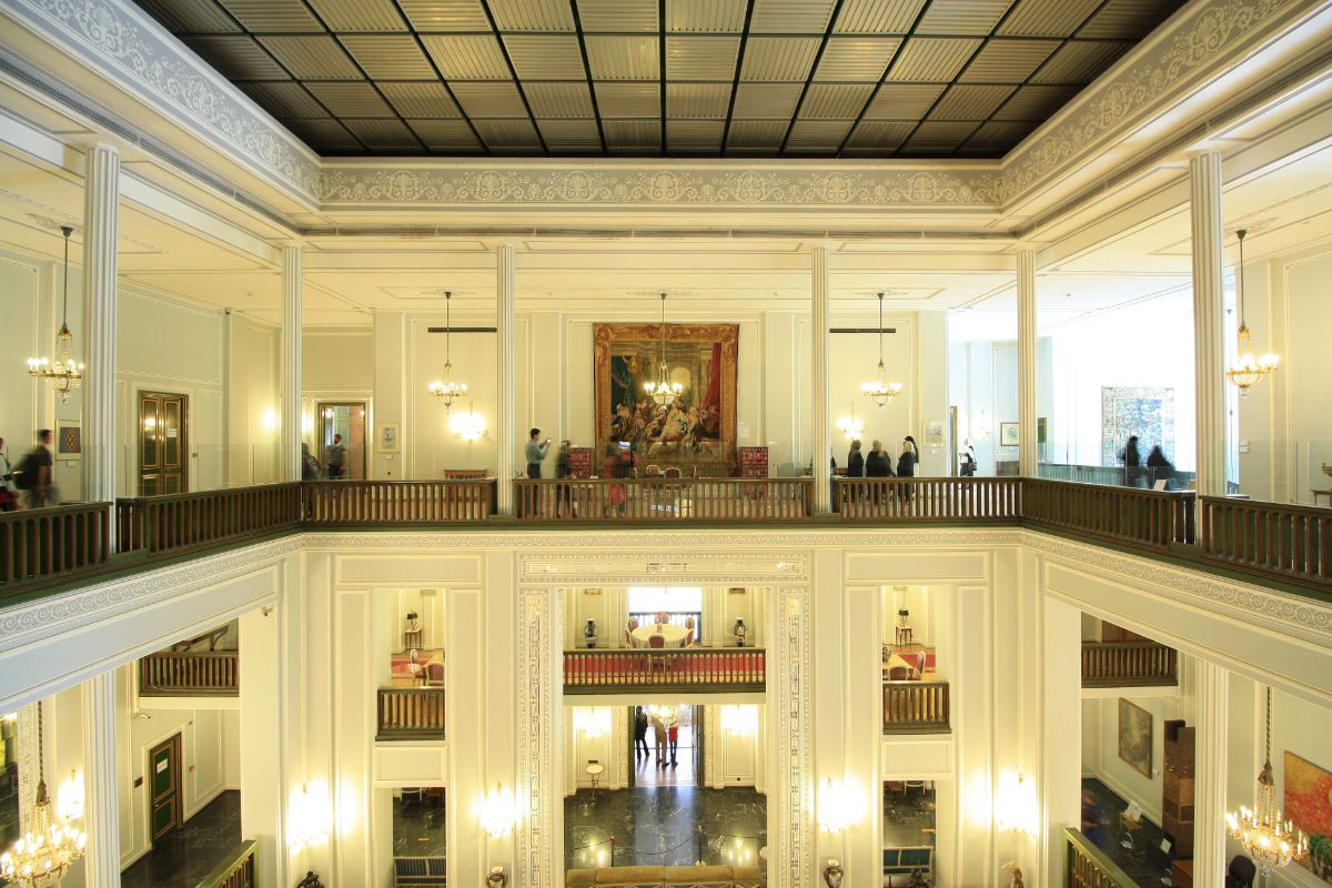 Caption: The interior of Niavaran Palace, originally designed for hosting guests rather than long-term family residence, reflects a guesthouse or hotel-like atmosphere.