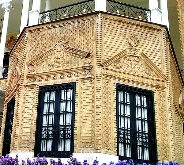 The Ahmad Shahi Pavilion is a cube-shaped, two-story building with polygonal projections on the southern side and three entrances located on its southern, northern, and eastern façades. It is situated north of the garden and the Sahebqaraniyeh Palace.