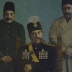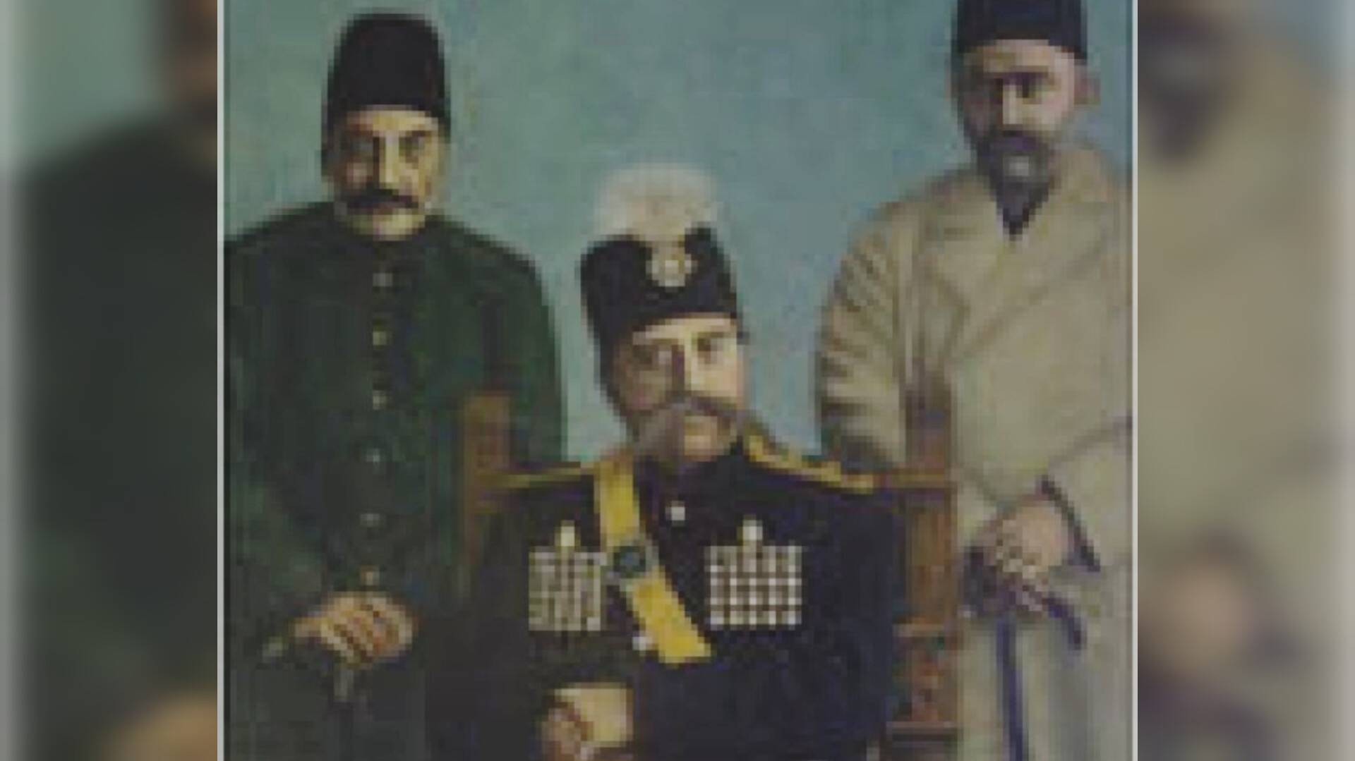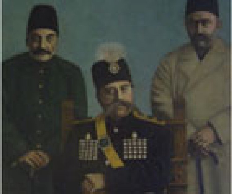 The portrait painting of Mozaffar al-Din Shah, Amin al-Soltan, and Abolqasem Khan Nasser al-Molk is located at the entrance of the western hall of the Sahebqaraniyeh Palace Museum.